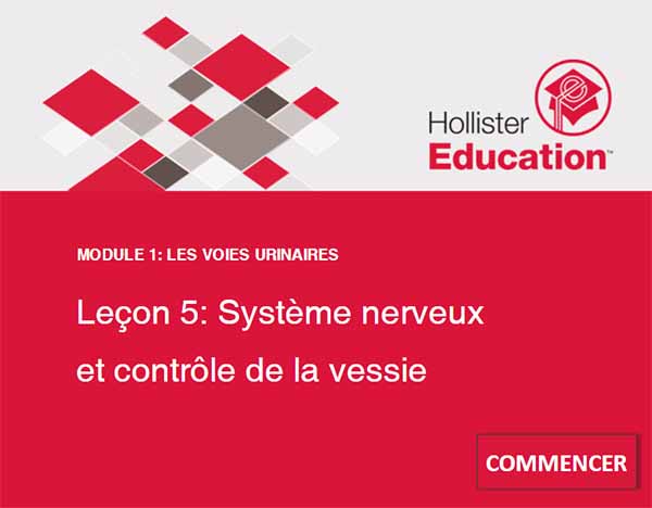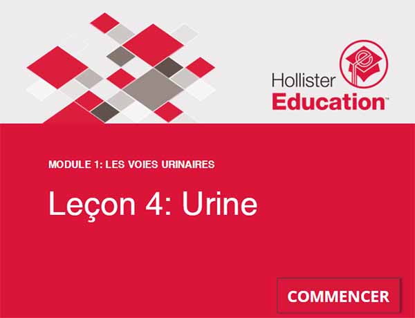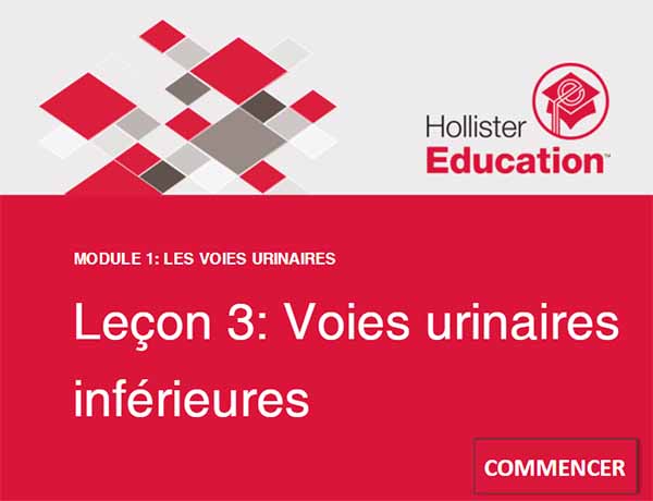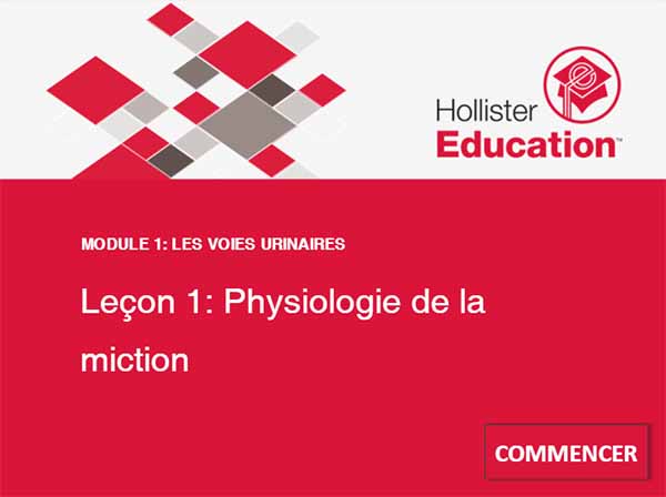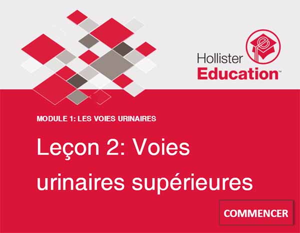 Hollister Education a développé un cours en ligne sur « L’appareil urinaire » afin d’offrir aux étudiants, au personnel infirmier débutant et aux autres personnes travaillant dans des établissements de santé et ayant une certaine expérience pratique en soins infirmiers, la possibilité d’en apprendre davantage sur ce domaine spécialisé des soins. Les cinq leçons peuvent être visualisées dans n’importe quel ordre, elles proposent des activités et une évaluation à la conclusion de celles-ci. Les sujets incluent : Physiologie de la miction, Voies urinaires supérieures, Voies urinaires inférieures, Urine, Système nerveux et contrôle de la vessie. Chaque leçon contient un glossaire des termes et des ressources de référence.