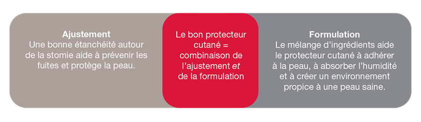 Lors du choix du protecteur cutané, la formulation est tout aussi importante que l'ajustement. Les ingrédients spécifiques qui composent le protecteur cutané sont responsables de l'« adhésivité » qui crée un joint étanche entre le protecteur cutané et la peau. La formulation offre également les qualités absorbantes nécessaires pour gérer l'humidité sans se décomposer.
