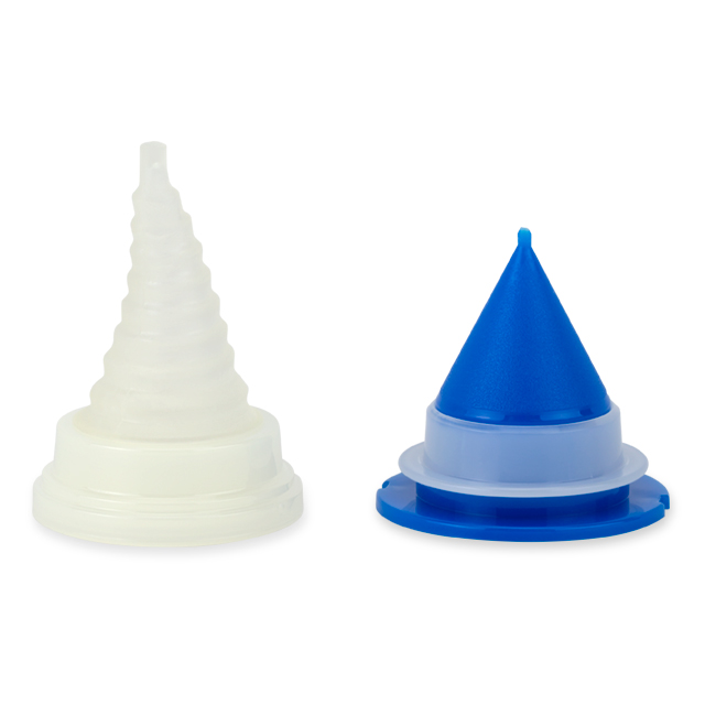 Le perce-membrane bleu perfore la poche afin de permettre à un drain, un tube ou un cathéter de sortir de la poche. Le mamelon gradué transparant et l’anneau facilitent l’étanchéité autour du tube.